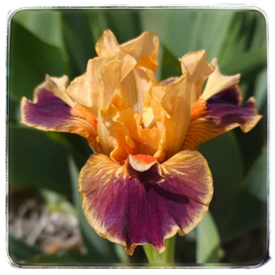 Стандарти яскраво жовто-помаранчеві (RHS 23B); стайли яскраво жовто-помаранчеві; фоли насичено пурпурові (RHS N81B) з яскраво жовто-помаранчевими плечима та краями; борідки яскраво червоно-помаранчеві (RHS 30A), пелюсткоподібні або ріжкоподібні, верхня сторона яскраво жовто-помаранчева, нижня сторона з насичено пурпуровими придатками; легкий солодкий аромат.