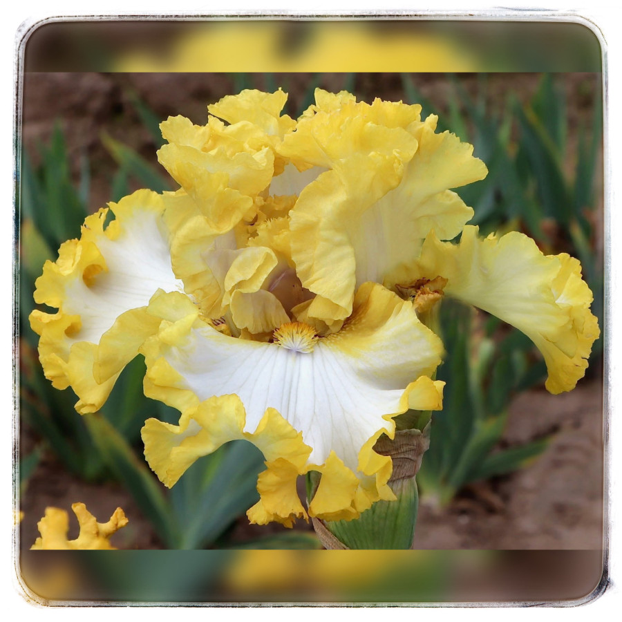 Великі, сильно рябі квіти мають стандарти блідо-оливково-білого кольору, що змішуються з широкими середньо-жовтими смугами. Сильно розкльошені фоли молочно-білого кольору прикрашені середньо-жовтими дужками та смугами. Його 3 гілочки несуть 8-9 бутонів.