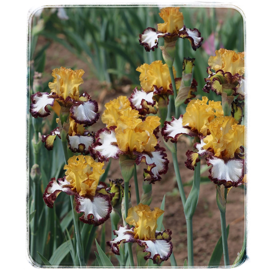 Опис | Стандарти насиченого золотисто-жовтого кольору мають тонкий червонуватий прожилковий край. Фоли мають різкий, чистий та чіткий білий колір з чіткою насиченою іржаво-червоною пунктирною смугою. Їхній абсолютно приголомшливий чистий та чіткий візерунок дуже помітний з усього саду. Гарно гофровані квіти, що тримаються високо на добре розпущених та розгалужених стеблах, додають краси. |