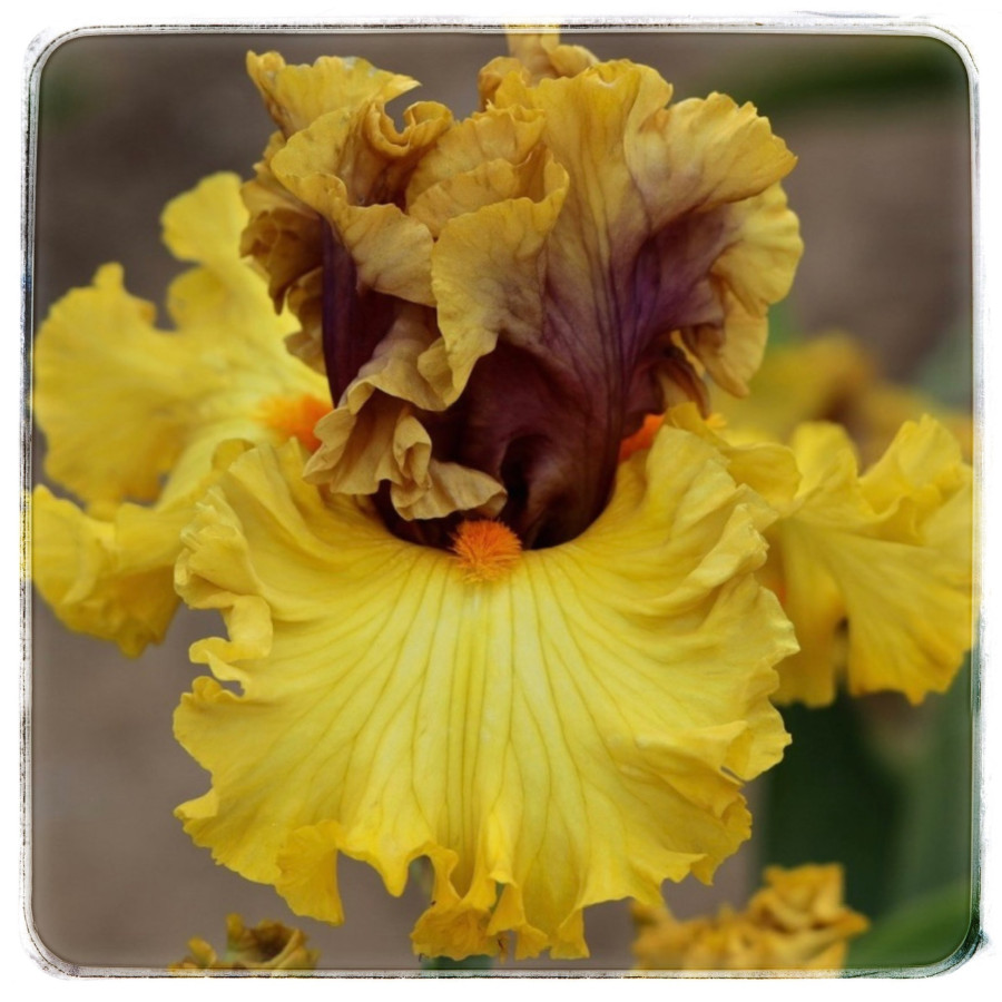 Опис | Стандарти яскраво-фіолетові, що переходять у восково-жовтий зовнішній відрізок ½˝; стайли жовті, фоли лимонно-жовті ); борідки суцільно-помаранчеві з сонячними променями. 'Idle Rich' X 'Power Struggle' |