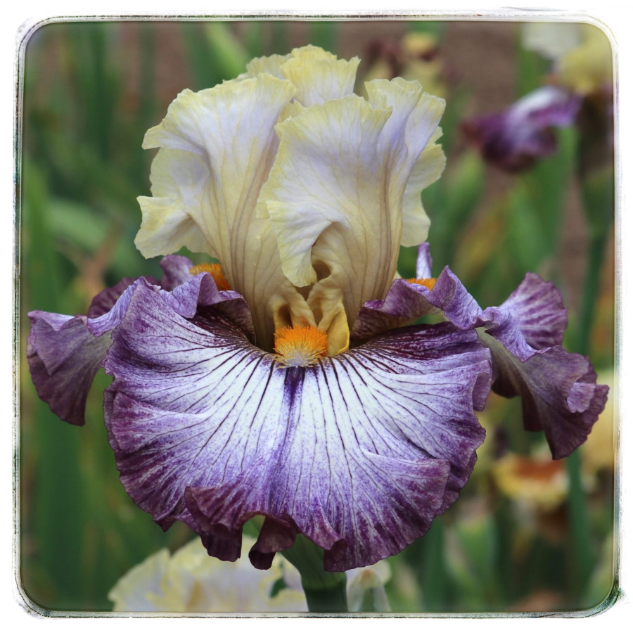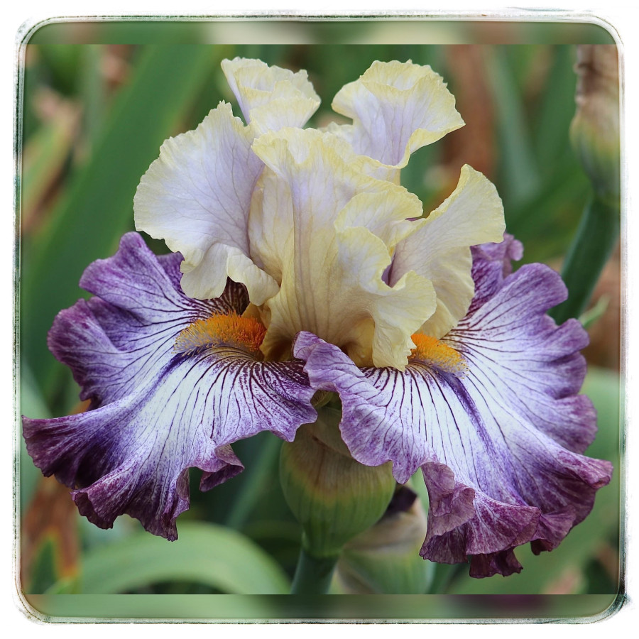 Стандарти світло-лавандові з приглушеним золотим посередині та по краях. Фоли білі з насиченими фіолетовими лініями, що тягнуться від борідки, а потім переходять у розмитий візерунок, переходячи у фіолетову смугу. Дуже широка та хвиляста форма унікального кольору.
