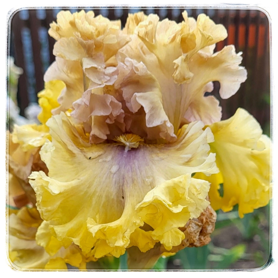 Стандарти та стайли димчасто-темно-жовті з бежевим відтінком, дуже сильно гофровані; фоли чисто жовті, невелика ділянка бежево-темно-лавандового кольору під борідкою, дуже сильно гофровані; борідки темно-жовті; виражений солодкий аромат.