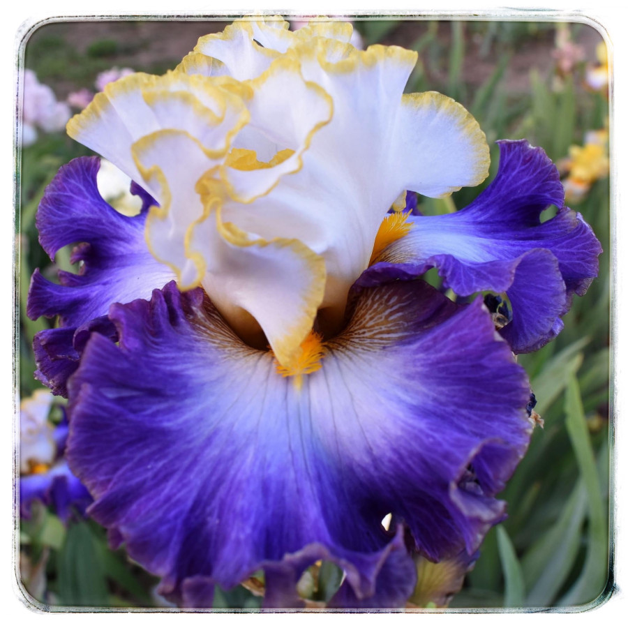Стандарти білі з яскраво-жовтою (RHS 16A) смугою шириною 1/4" по краю; стайли білі з яскраво-жовтими ділянками на гребінцях; фоли фіолетово-блакитні, світліші навколо та під борідкою, з чіткою пурпуровою облямівкою по краю, буро-помаранчеві в горлі; борідки помаранчеві.