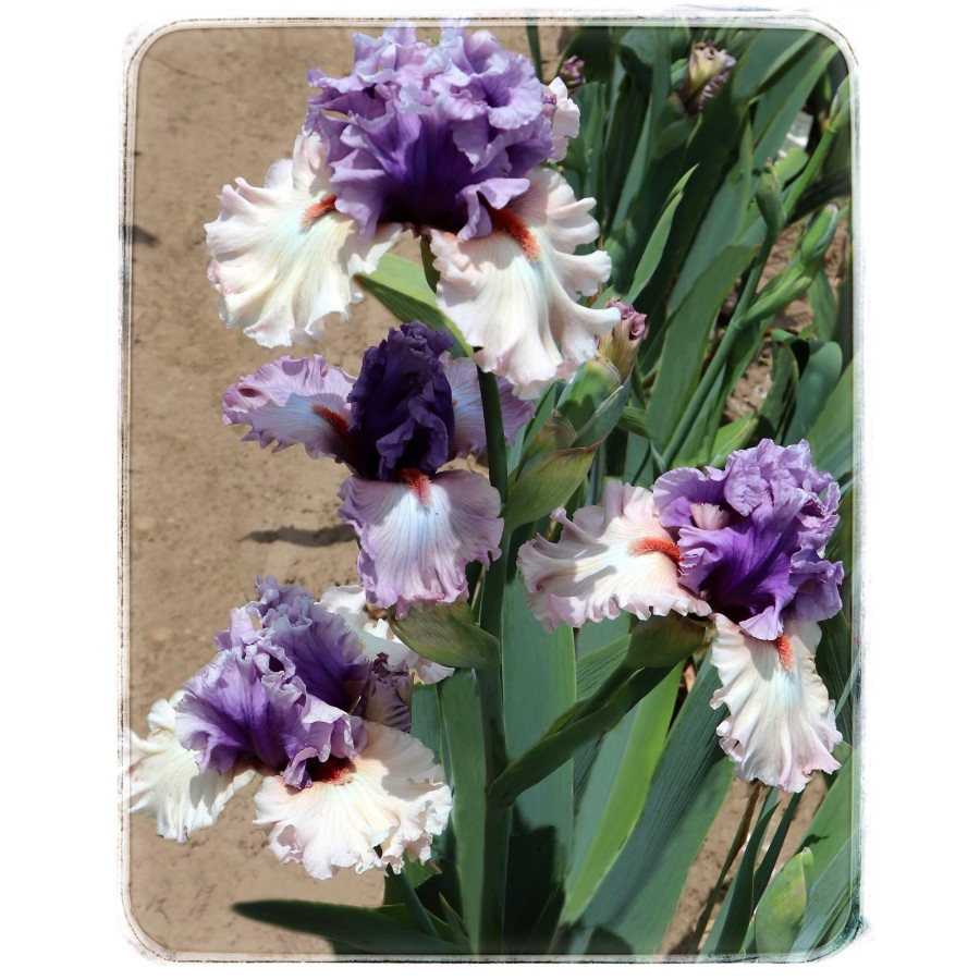 Опис | Сорт High On Life не тільки має чудові квіти, але й його відмінною рисою є надзвичайно міцні розгалужені стебла. Темно-бузкові стандарти переходять у світлі сріблясто-бузкові краї з акуратними бузково-рожевими стайлами, що визирають. Білі нижні фоли пофарбовані в світло-рожевий колір із середньо-рожевими текстурними прожилками. Коралові борідки оживляють образ. Від трьох до чотирьох гілок плюс відросток мають 9-11 бутонів. |