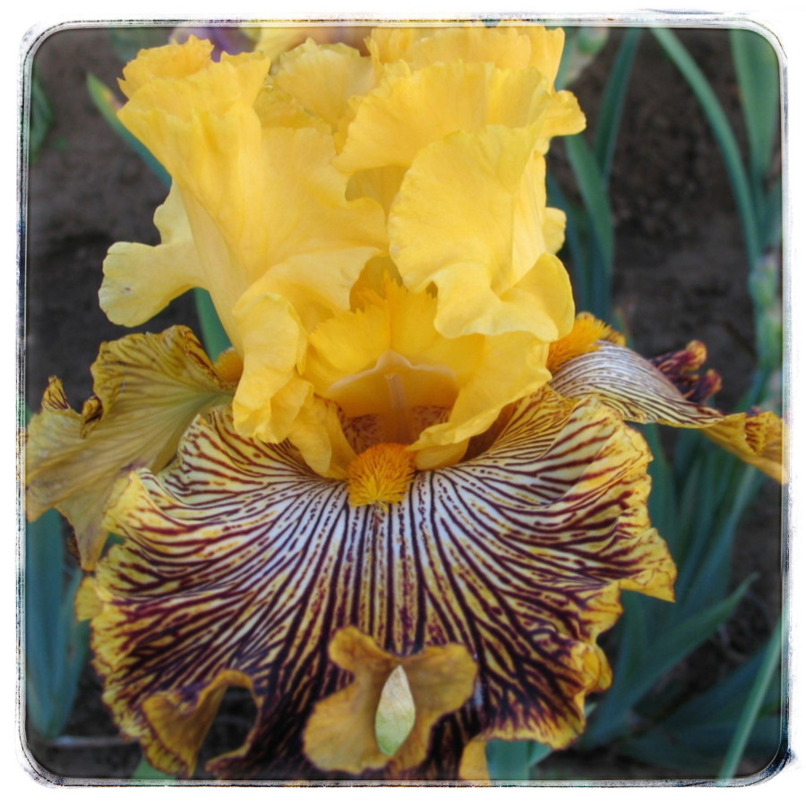 Стандарти та стайли — жовті; на фолах біла зона навколо борідки простягається на третину довжини пелюстки, нижні дві третини — жовте тло з тонкими темно-фіолетовими лініями, що виходять із горла й поступово потовщуються, доходячи до жовтого краю; борідки — жовтогарячі (RHS 23A); легкий аромат.