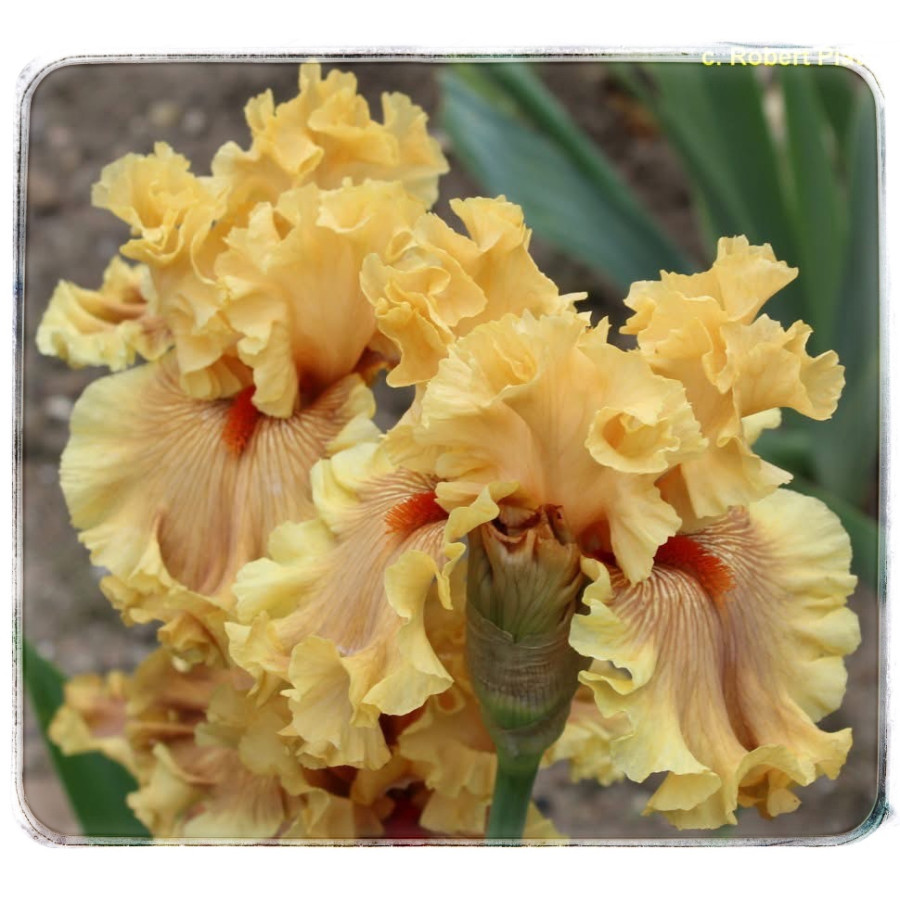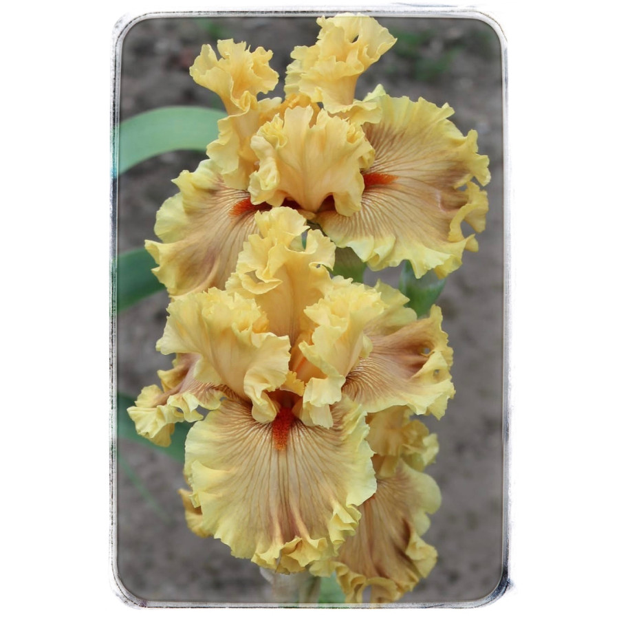 Стандарти та стайли світло-жовтогарячі; фоли — світло-жовтогарячі з коричневими жилками та світло-коричневими проміжками між ними; борідки — цегляно-червоні; легкий солодкий аромат.