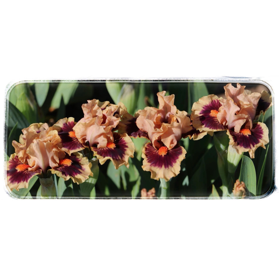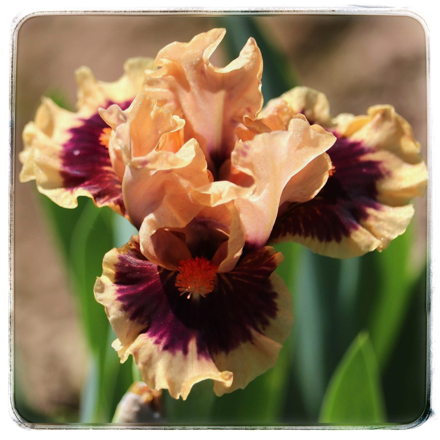 Стандарти середнього персикового кольору та лимонно-персикова облямівка на бордових фолах. Дуже гофрований та яскравий.